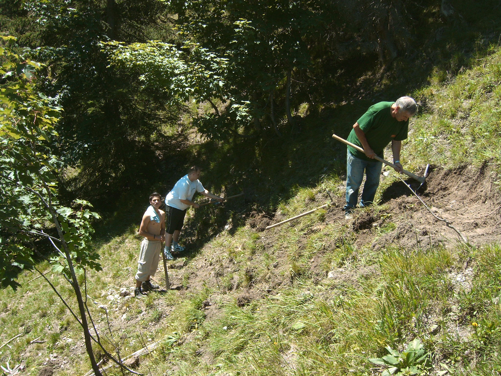 Patrick, Florian & Projektleiter Kurt Diem bei Weganlegung zur Echowand (Foto v. Martin Hangweyrer)